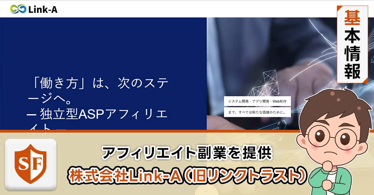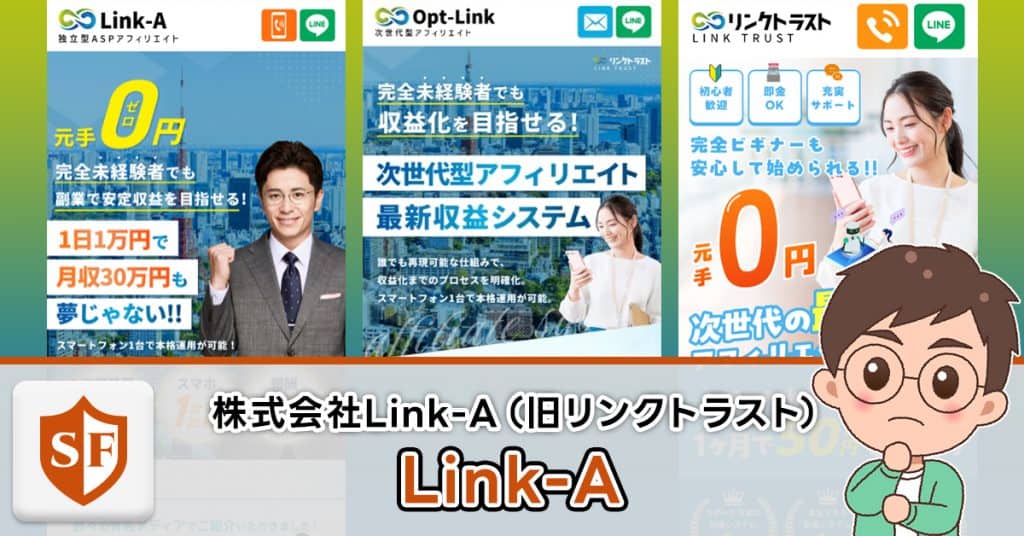 株式会社Link-A(旧リンクトラスト)は独立型ASPアフィリエイトや次世代型アフィリエイトと謳う広告ページで「Link-A」「リンクトラスト」「Opt-Link」という副業商材を紹介しています。